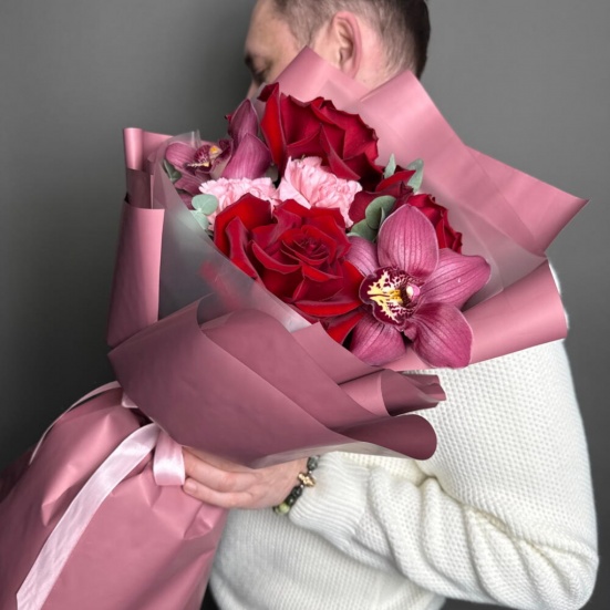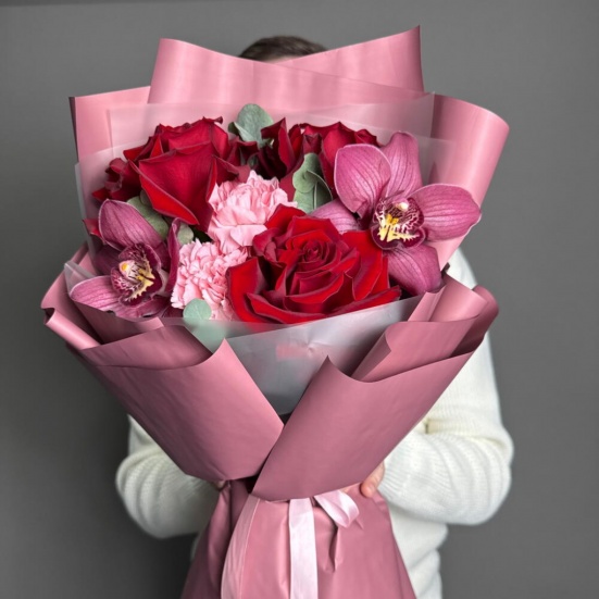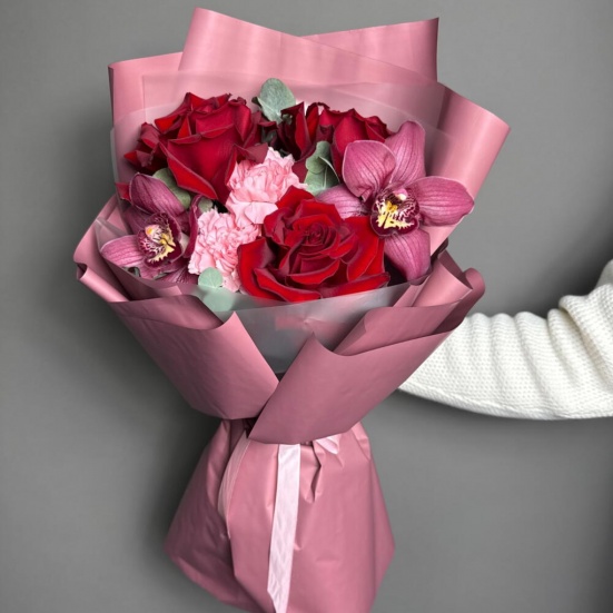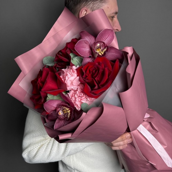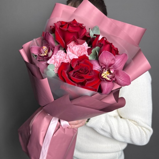 Букет из 3 красных роз, орхидей и диантуса в Новокузнецке